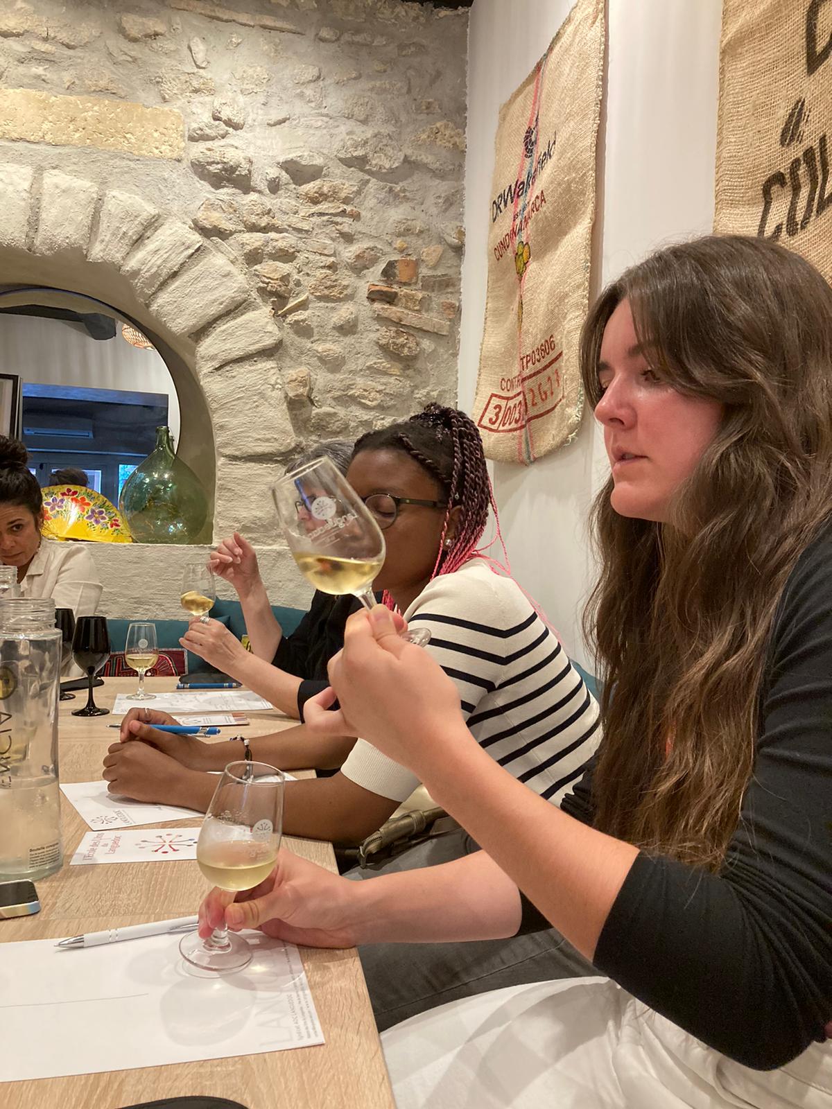 - Enfin, nous avons comparé deux vins blancs, puis deux vins rouges, en les observant et en les dégustant côte à côte. Nous avons ainsi appris à décrypter les nombreux signaux visuels du vin, comme la robe, les larmes, l’opacité…