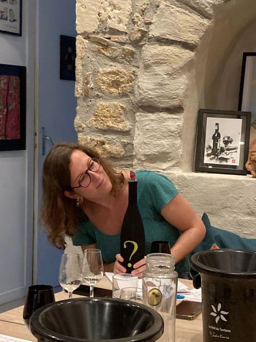 - Ensuite, nous avons goûté un vin à l’aveugle (littéralement, car nous avions les yeux bandés) et partagé nos ressentis pour essayer d’identifier le type de vin. C’était un rosé !
